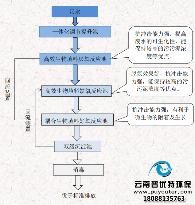 工艺为:高效生物填料厌氧池(A)+高效生物填料缺氧池(A)+耦合生物填料好氧反应池(O)+双级沉淀池+消毒